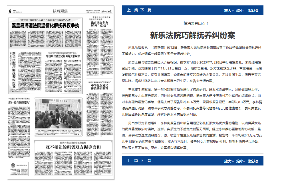河北法治报讯 (唐新花)9月2日,新乐市人民法院马头铺镇法官工作站特邀调解员李林通过不懈努力,成功调解一起同居关系子女抚养纠纷。 原告王某与被告刘某经人介绍相识,按农村习俗于2023年7月28日举行结婚典礼,未办理结婚登记手续。双方婚后于同年11月21日生育一女,随原告生活。双方之前缺乏了解,草率结合,而后发现脾气性格不合,没有共同语言,始终未能建立起良好的夫妻关系,无法共同生活,原告王某诉至法院,请求法院依法判决女儿跟随自己生活,被告支付抚养费。 李林接手该案后,第一时间对案件情况进行了梳理研判,联系双方当事人,分别做调解工作。被告同意女儿由原告抚养,但针对女儿抚养费问题,提出双方是按照农村习俗举行的结婚仪式,当时未办理结婚登记手续,但是支付了原告彩礼16.6万元,现要求原告返还一半彩礼8.3万元。李林情法兼具进行调解,劝导当事双方冷静思考,不要因抚养费等问题影响女儿的健康成长,要从关爱女儿健康成长的角度出发,理智处理双方感情纠纷问题。 见当事双方矛盾缓和,李林向原告提出被告用退还彩礼抵顶女儿抚养费的建议,以确保其女儿的抚养费能够按时保障。这样,实质性的矛盾焦点就迎刃而解。经过李林推心置腹地耐心劝解,最终,当事双方达成调解协议:原、被告非婚生女儿随原告共同生活,被告将一半彩礼钱8.3万元与女儿至18周岁的抚养费互相抵顶,双方互不给付;被告对女儿有探望的权利,探望时原告予以协助;其他双方互不追究。至此,该案得以调解结案。