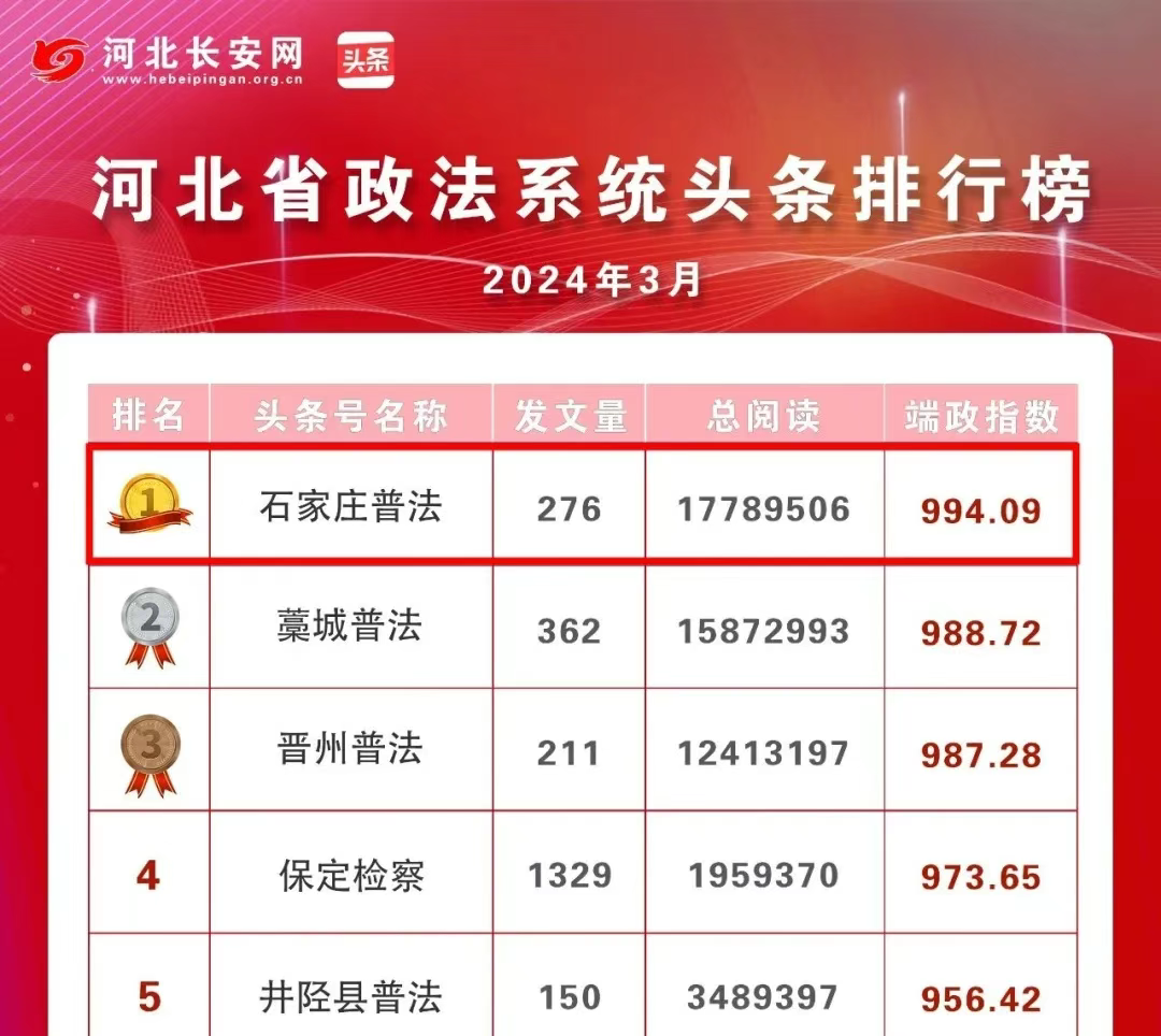 “石家庄普法”头条号、抖音号、微博号、微信公众号全年累计发文1.1万篇,头条号总阅读量达3.6亿人次,全市头条矩阵进入全国榜单463次,持续入选中央政法委新媒体影响力榜单和长安河北排行榜单,宣传效果明显。