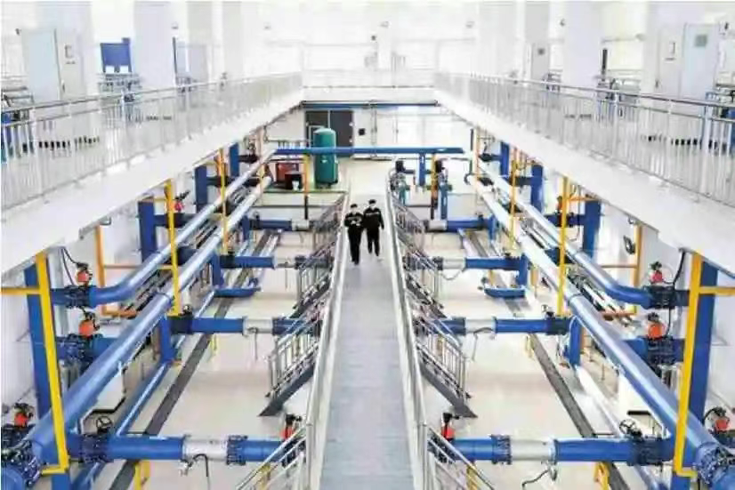 4月11日,在河北泓宁供水有限责任公司东汪水厂,工作人员在检查输水管道。