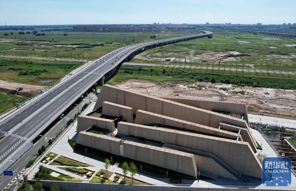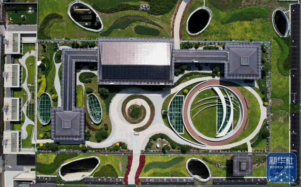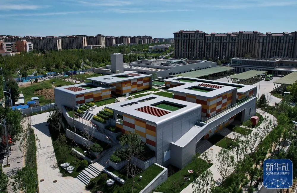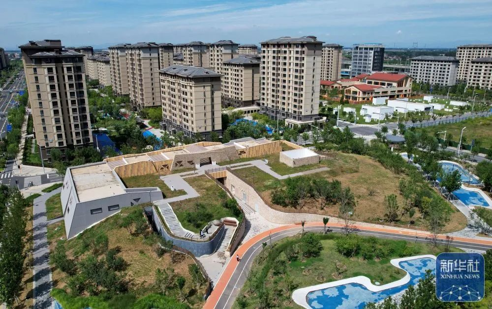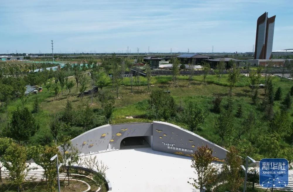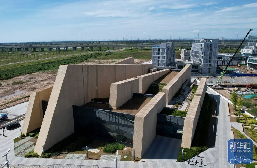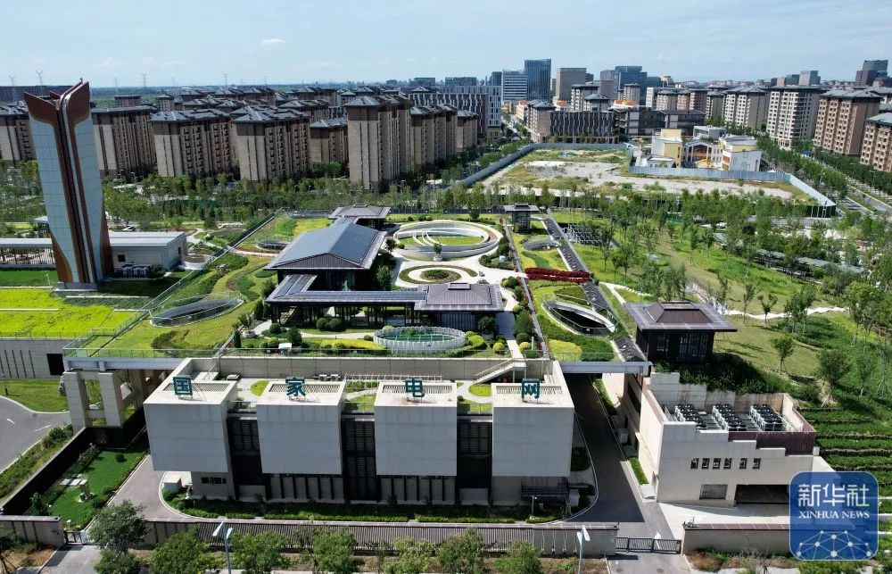 ↑9月5日拍摄的河北雄安新区“智慧能源立方”——剧村220千伏变电站外景。该变电站屋顶覆土建设成公园,形成与城市融合共生的图景(无人机照片)。