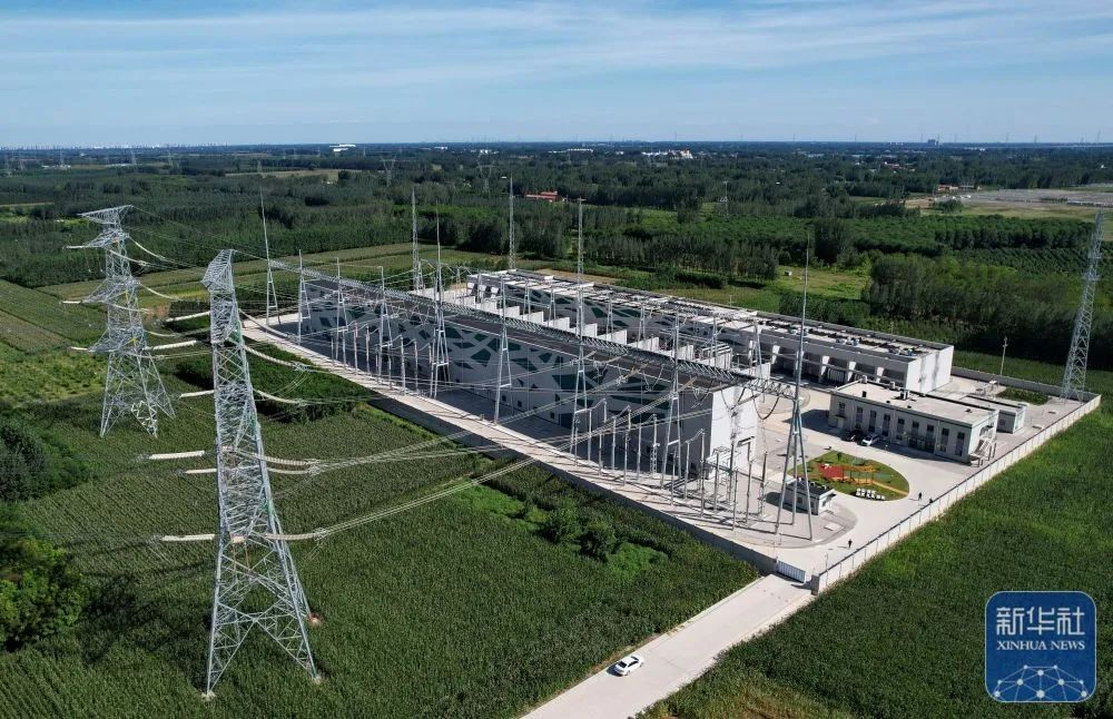 ↑9月5日拍摄的河北雄安新区“蓬勃之树”——雄安东500千伏超高压变电站景色(无人机照片)。