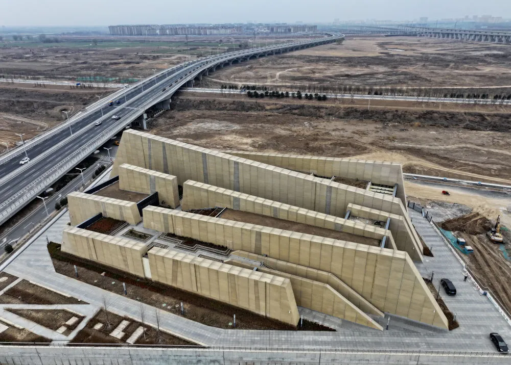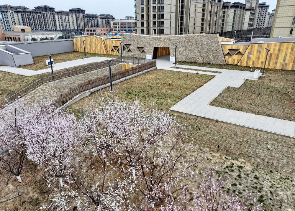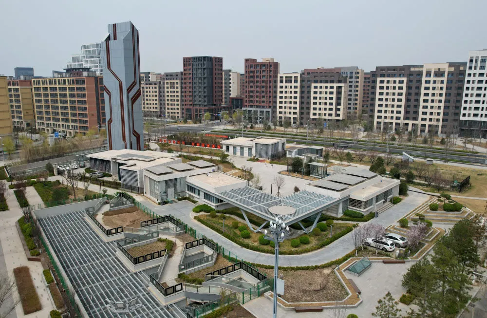 3月26日拍摄的河北雄安新区“智慧能源立方”——剧村220千伏变电站外景。该变电站屋顶覆土建设成公园,形成与城市融合共生的图景(无人机照片)。新华社记者 杨世尧 摄