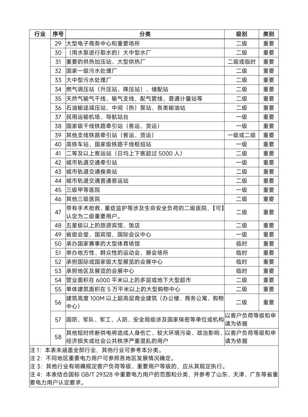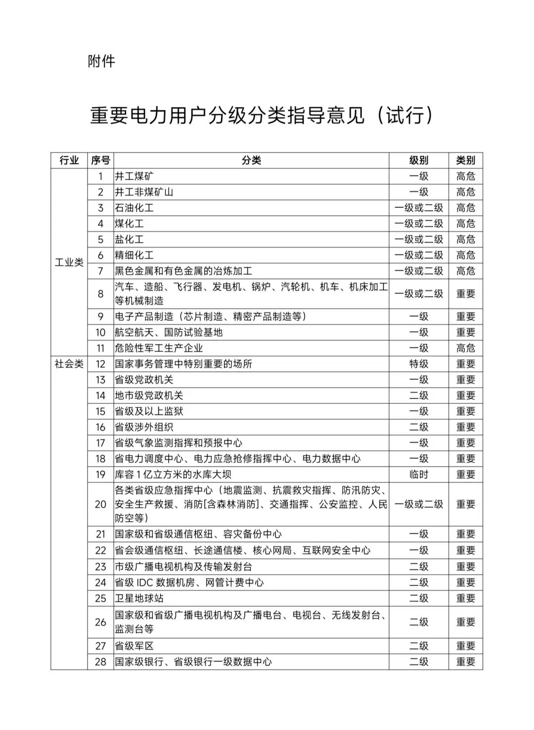 (二)重要电力用户分级。根据供电可靠性的要求以及供电中断的危害程度,重要电力用户分为特级、一级、二级重要电力用户和临时性重要电力用户。重要电力用户的界定和分级参照《重要电力用户供电电源及自备应急电源配置技术规范》(GB/T29328-2018)和《重要电力用户分级分类指导意见(试行)》(见附件)执行。