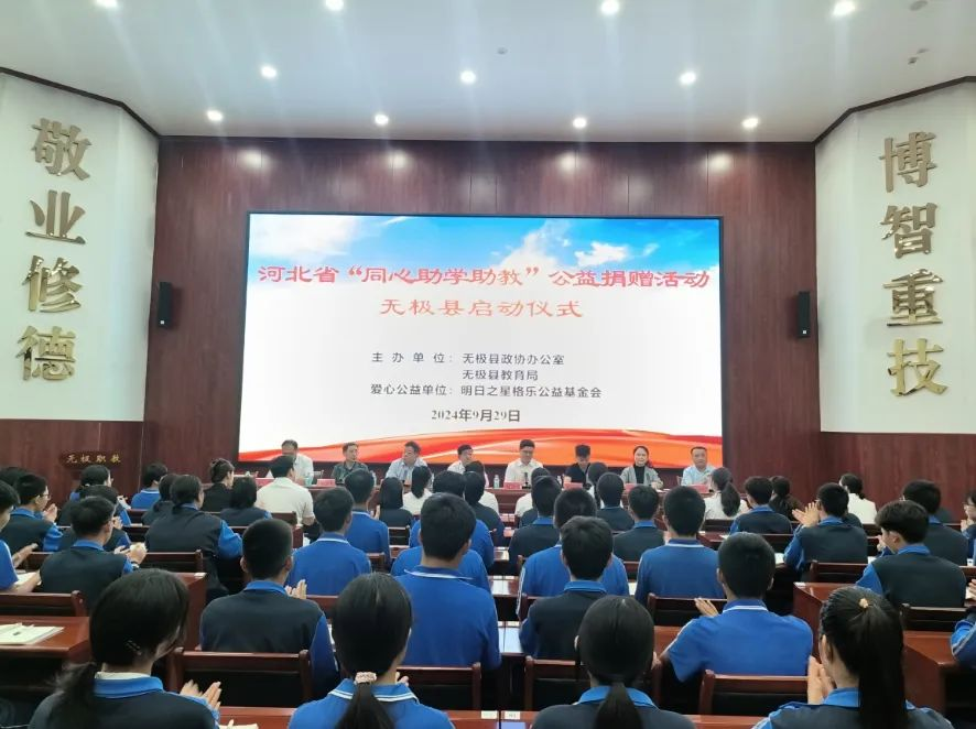 9月29日,河北省“同心助学助教”公益捐赠活动无极县启动仪式在无极县职教中心圆满举行,无极县政协主席申立功,格乐公益基金会副理事长刘加亮,无极县教育局局长李占飞出席活动。
