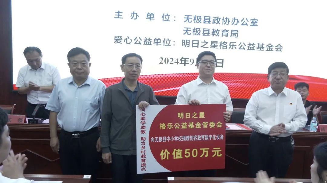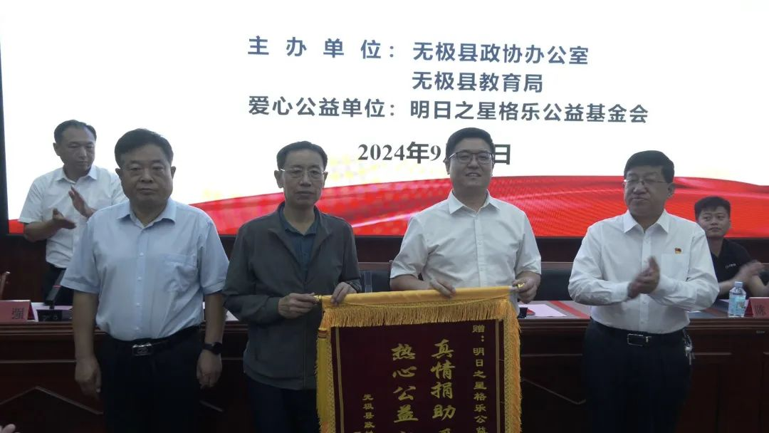 活动中,格乐公益基金会向无极县教育局递交捐赠牌,无极县教育局向格乐公益基金赠送锦旗。