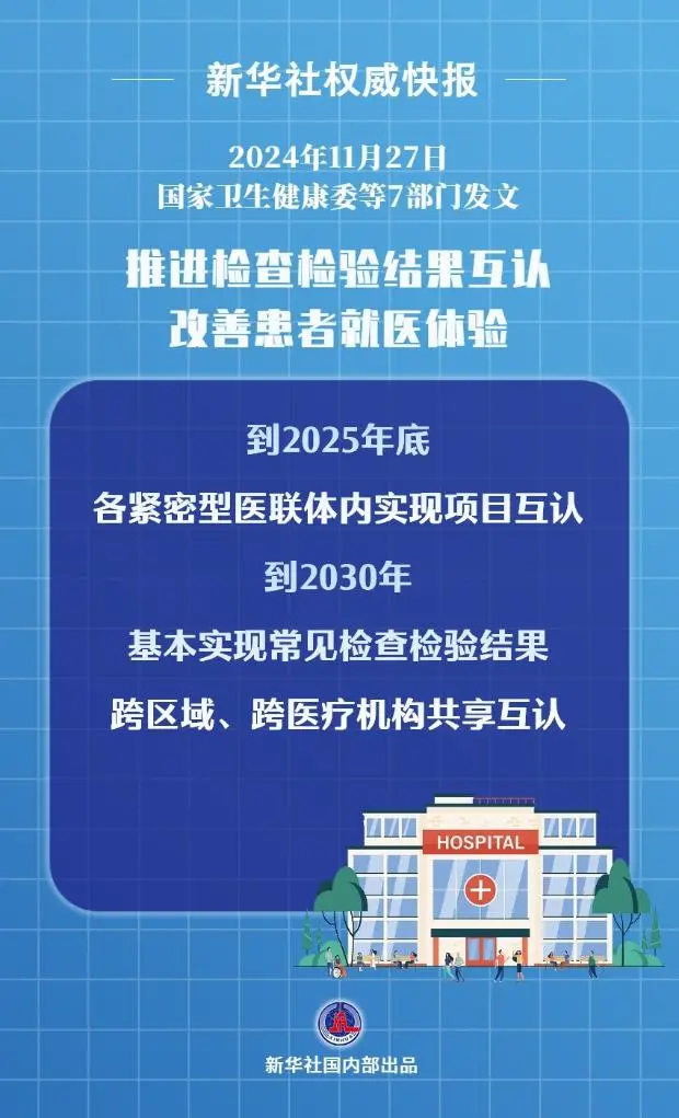 到2025年底,各紧密型医联体(含城市医疗集团和县域医共体)实现医联体内医疗机构间全部项目互认,各地市域内医疗机构间互认项目超过200项。到2027年底,各省域内医疗机构间互认项目超过300项;京津冀、长三角、成渝等区域内医疗机构互认项目数超过200项。到2030年,全国互认工作机制进一步健全完善,检查检验同质化水平进一步提高,结果互通共享体系基本建立,基本实现常见检查检验结果跨区域、跨医疗机构共享互认。