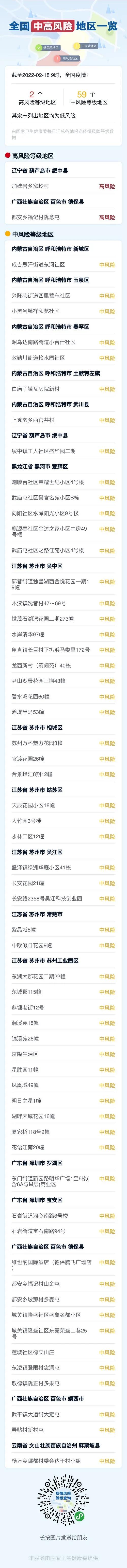 2月17日0-11时,呼和浩特市新增2例本土新冠肺炎确诊病例、10例新冠病毒核酸检测阳性人员;2月17日0-24时,苏州新增新冠肺炎确诊病例4例,无症状感染者10例。为严格落实“外防输入、内防反弹”的防控要求,从严从紧,科学精准,有效控制和降低疫情传播风险,保障人民群众的身体健康与生命安全,石家庄市疾控中心提醒广大市民: