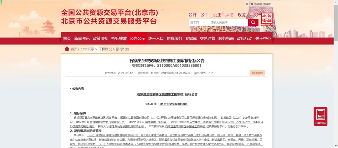 9月12日,北京市公共资源交易服务平台发布《石家庄至雄安新区铁路施工图审核招标公告》。