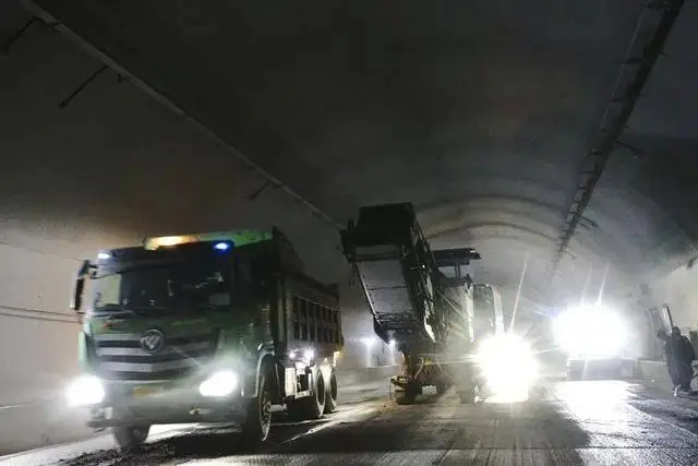 记者驱车沿着京蔚高速穿越重重大山,来到了小龙门隧道的施工现场。隧道入口处,一幅壁画再现了京西古道驼队穿行而过的繁华景象。工人们登上升降平台,正在为隧道安装设备设施。