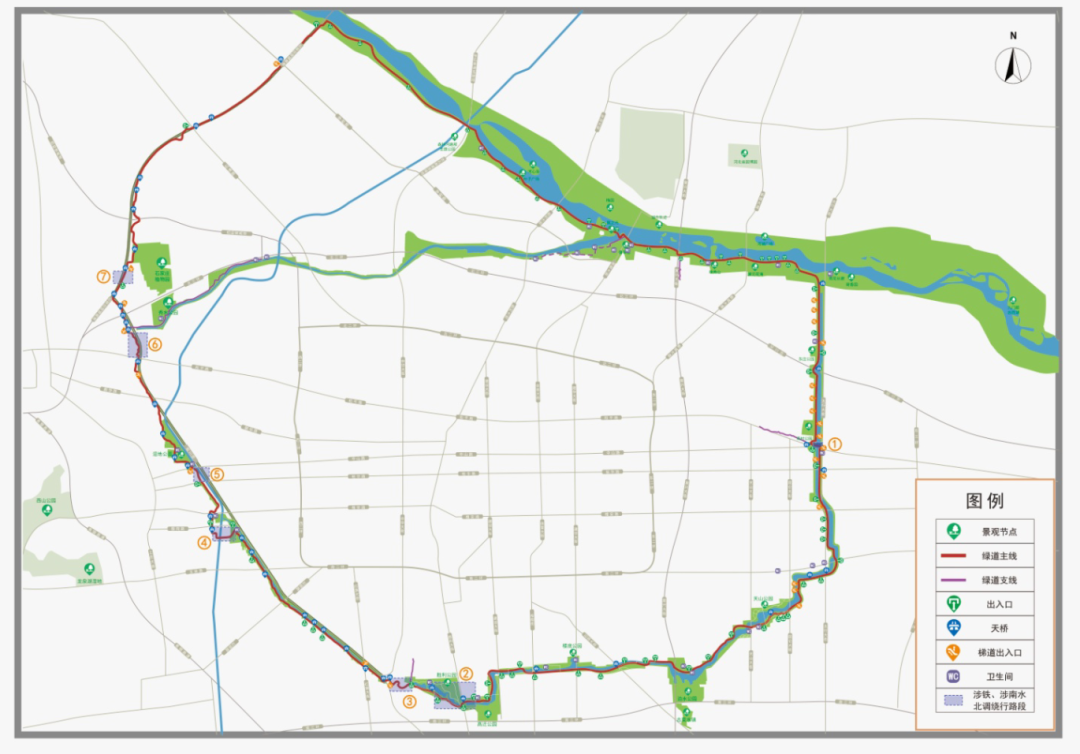 “路通”,在改造现有绿道和游憩路的基础上,新建地上天桥、水面栈桥以及地下穿桥,形成全程无障碍贯通的骑行道、步行道。“景美”,绿道建成后将串联起滹沱河、环城水系沿线映秀山公园、明曦湖公园、叠翠山公园、星野公园、云龙公园、拾迹公园、奥体公园、胜利公园、高迁公园、楼底公园、泊水公园、天山公园、南村公园、植物园、秀水公园、翠屏湿地公园等16座景观优质的公园,充分利用好现有景观资源,同时通过丰富植物品种、梳理景观层次、修补绿化断带等措施,改造绿道沿线现状长势不好的绿地,全面提升沿环城绿道景观品质。“智游”,在绿道沿线建设若干活动节点,增强智慧化管理与服务水平,设置停车场、公厕以及绿道标识系统,打造多功能的公共服务带。“畅达”,加强环城绿道与中心城区串联衔接,优化接驳口出入管理,实现环城绿道与滹沱河、环城水系公园广场进出顺畅。来环城绿道可以欣赏到的城市美景。环城绿道将石家庄市周边最具特色的景观资源串联到一起,整合绿道沿线的城市美景。北线可以欣赏到滹沱河花海、滹沱花田、晓月湖湿地、河湖广场、冀之光塔、音乐喷泉、草地音乐谷、观鸟台、揽秀塔、云龙公园、拾迹公园、映秀山公园、明曦湖公园、叠翠山公园等山水景观,同时还可以看到古城正定、正定新城优美的城市天际线,还可以看到“鸟中国宝”东方白鹳的身影,还可以领略太平河片区的魅力。