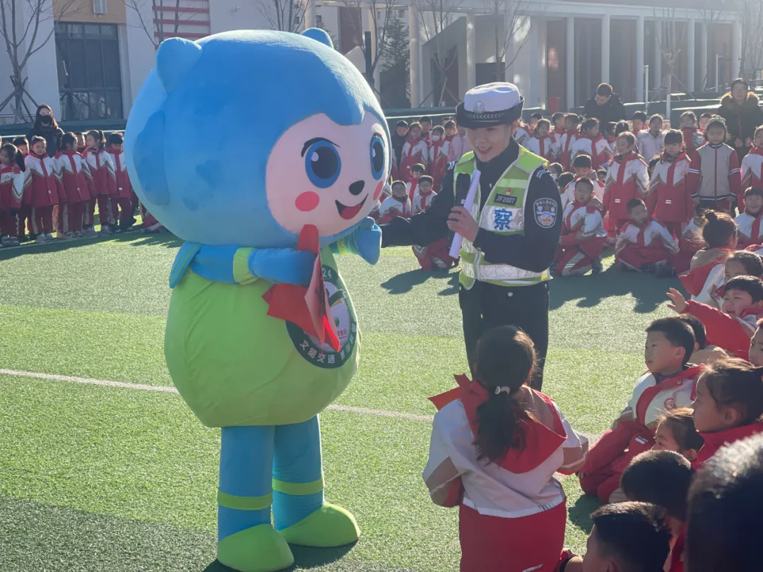 互动环节中,交警携手“路宝儿”提出了一些与交通安全相关的问题,同学们积极踊跃回答。答对的同学还获得了奖励,现场气氛十分活跃。同时,还鼓励同学们将学到的交通安全知识带回家,与家人们共享。除了交通安全知识讲解,交警和“路宝儿”一起为师生们送上了“福”字和交通安全宣传资料。“福”字寓意着平安幸福,表达了交警对师生们的美好祝愿;宣传资料则涵盖了交通安全的各个方面,为师生们提供了更多的关于交通安全知识的学习资源。