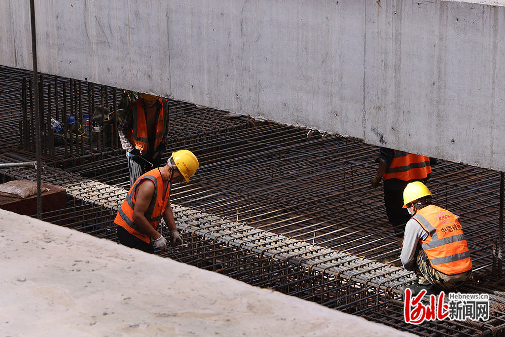 8月22日,工人在石家庄地铁5号线解放大街站现场施工作业。