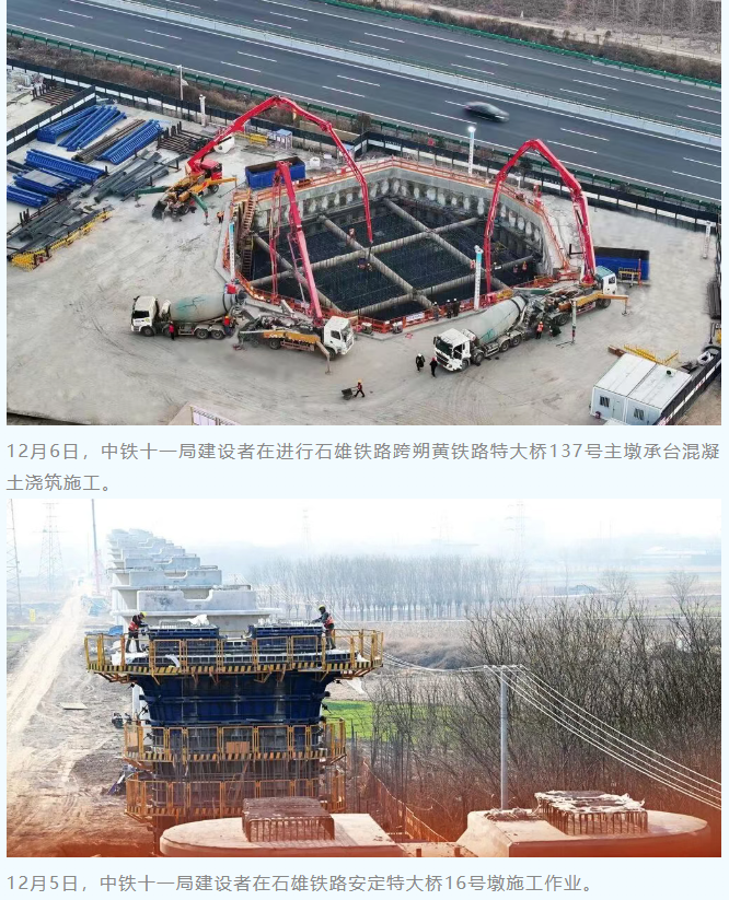 12月6日,中铁十一局建设者在进行石雄铁路跨朔黄铁路特大桥137号主墩承台混凝土浇筑施工。石雄铁路跨朔黄铁路特大桥137号主墩承台