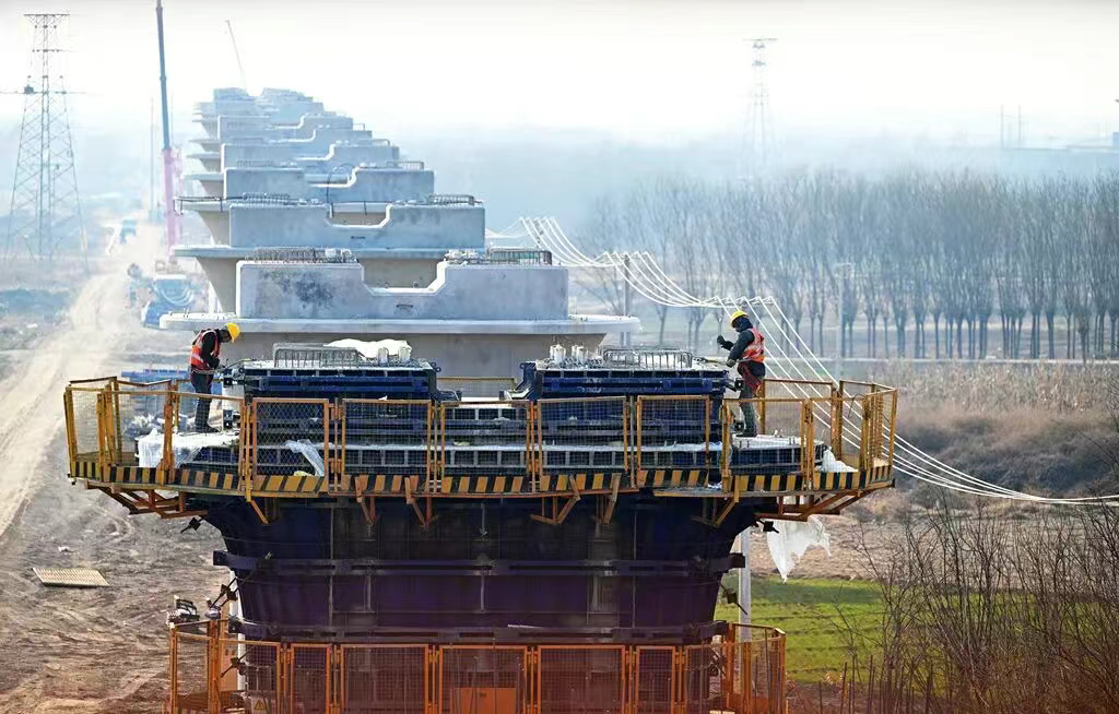 12月5日,中铁十一局建设者在石雄铁路安定特大桥18号墩施工作业。