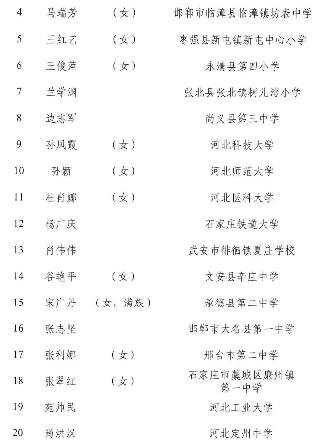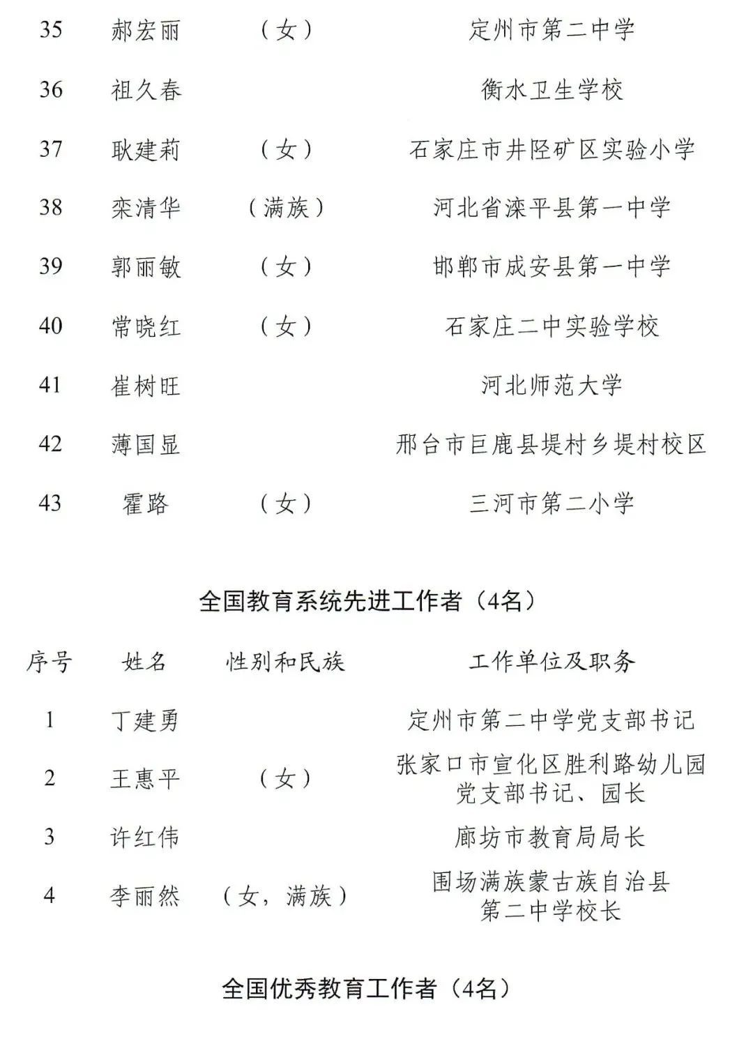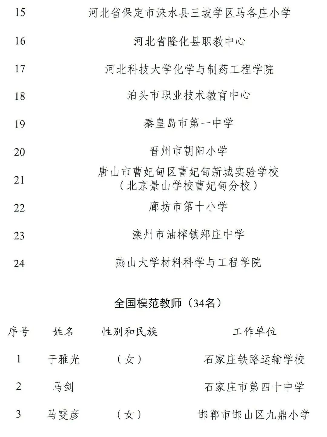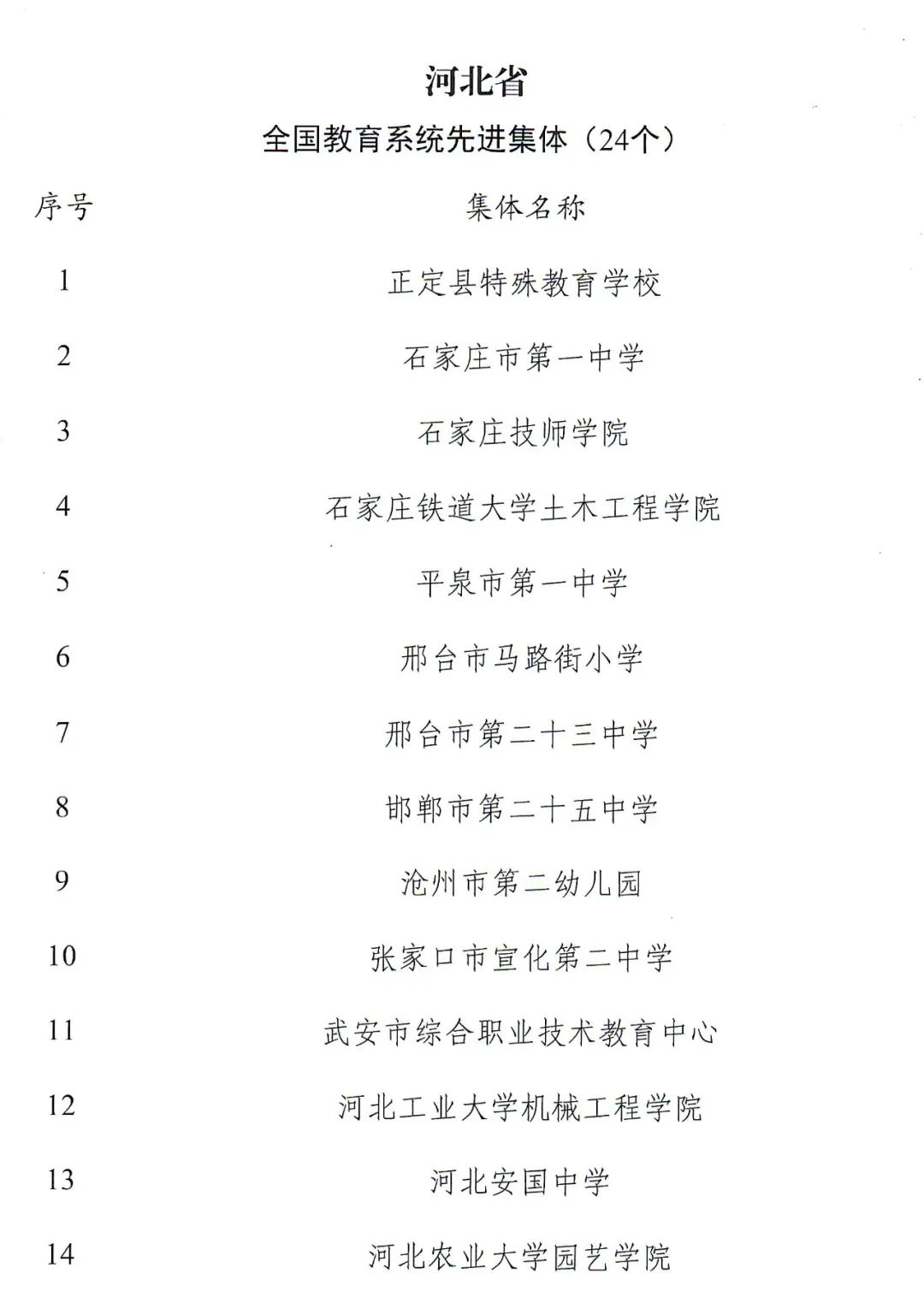 正定县特殊教育学校、石家庄市第一中学等24个单位被评为全国教育系统先进集体,石家庄铁路运输学校于雅光、石家庄市第四十中学马剑等34名教师被评为全国模范教师,邯郸市丛台区曙光小学于金燕、石家庄市东风西路小学马贝贝等43名教师被评为全国优秀教师,定州市第二中学党支部书记丁建勇等4人被评为全国教育系统先进工作者,定兴县教育和体育局局长齐小刚等4人被评为全国优秀教育工作者。