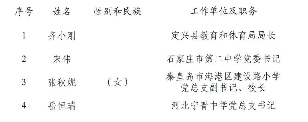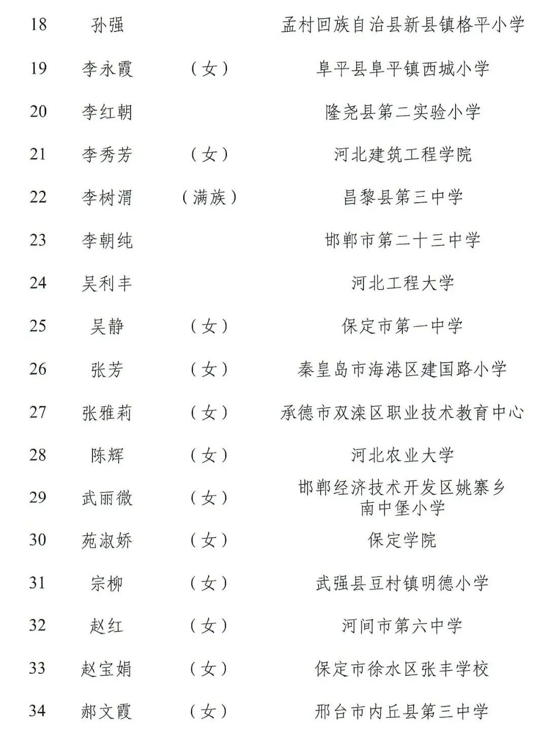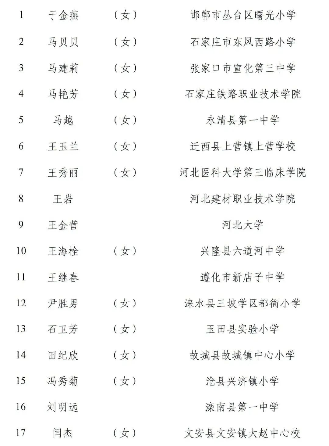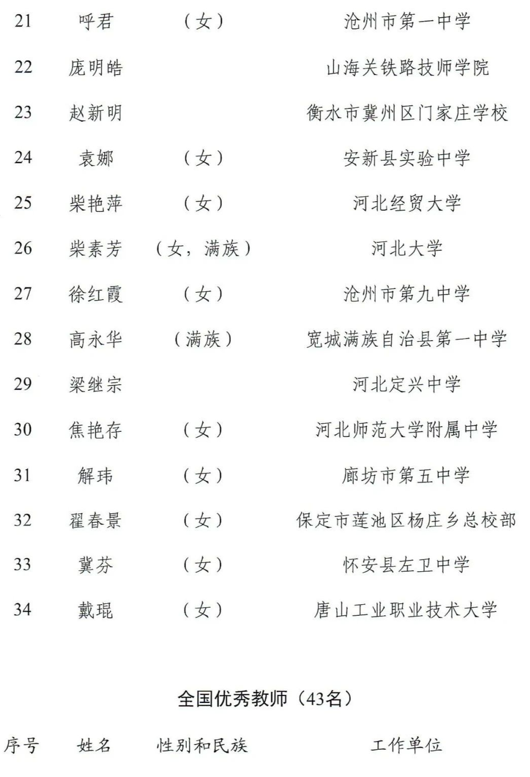 正定县特殊教育学校、石家庄市第一中学等24个单位被评为全国教育系统先进集体,石家庄铁路运输学校于雅光、石家庄市第四十中学马剑等34名教师被评为全国模范教师,邯郸市丛台区曙光小学于金燕、石家庄市东风西路小学马贝贝等43名教师被评为全国优秀教师,定州市第二中学党支部书记丁建勇等4人被评为全国教育系统先进工作者,定兴县教育和体育局局长齐小刚等4人被评为全国优秀教育工作者。