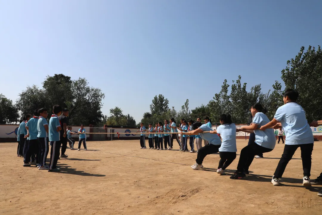 河北省保定市涞水县特教中心的学生正在和涞水县义安镇西义安小学的学生进行拔河比赛
