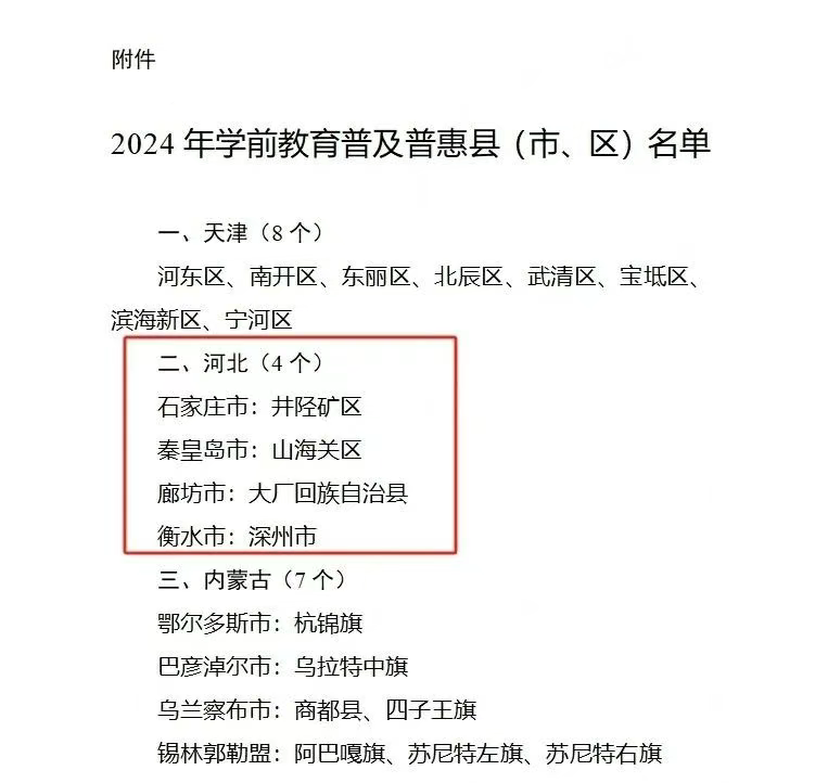 近日,按照《中共中央 国务院关于学前教育深化改革规范发展的若干意见》要求以及《县域学前教育普及普惠督导评估办法》规定,通过县级自评、市级初核、省级评估、国家认定的程序,教育部认定301个县(市、区)为学前教育普及普惠县。其中,河北省石家庄市井陉矿区、秦皇岛市山海关区、廊坊市大厂回族自治县、衡水深州市4地入选。