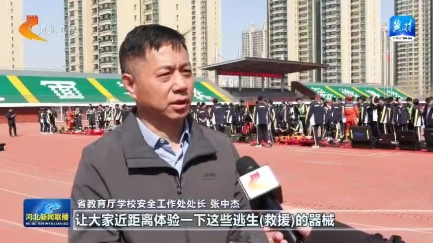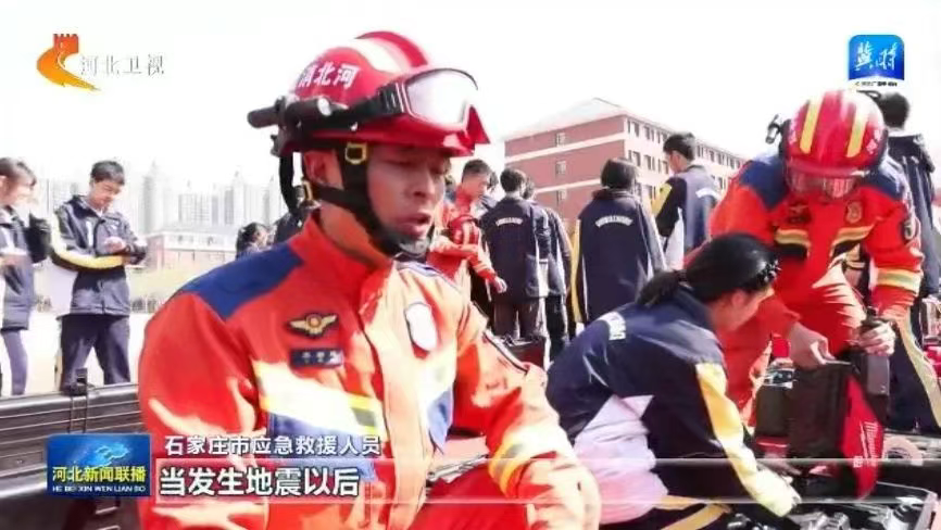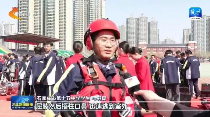 在石家庄市第十五中学,当地应急救援人员携带专业设备走进校园,让同学们体验中学习应急救援知识。