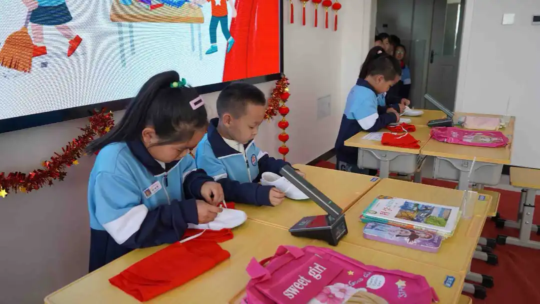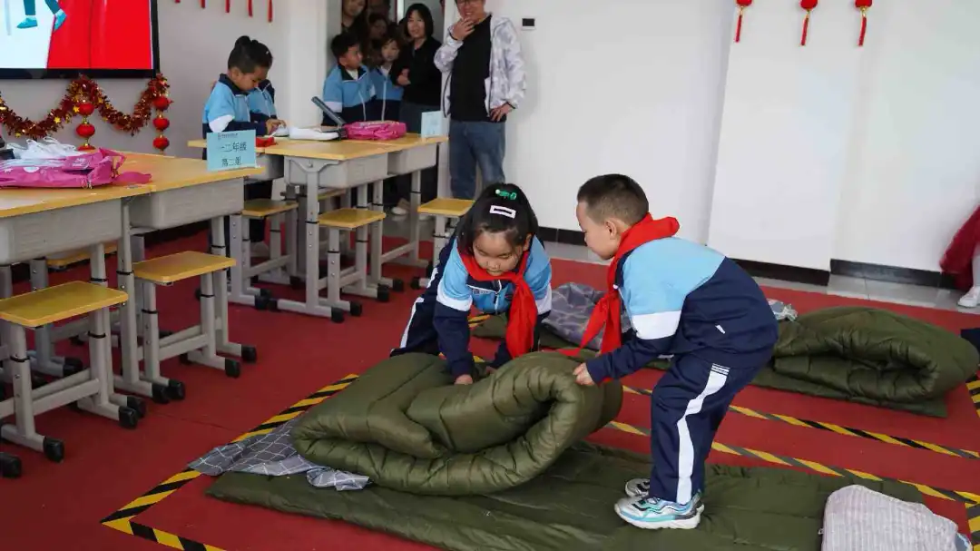 本次竞赛设1至2年级低年级组“巧手趣整”内务整理和3至5年级中高年级组“巧手焕新”整理学习空间两个综合项目。比赛现场,小小的鞋带在选手们的指尖穿梭,他们的动作敏捷而熟练,一根根鞋带在他们手中变成了展示技能的舞台。在铺床收纳环节,面对堆成小山的衣物,选手们毫不畏惧,熟练地将杂乱的衣服分类后叠整齐放入收纳框中。选手们展开床单,让床单平整地覆盖在床面上,叠好被子,动作一气呵成。原本杂乱的床铺变得整洁舒适,展示出他们出色的动手能力。快速折叠、环绕、打结,一系列动作流畅自然,鲜艳的红领巾在他们的胸前绽放出最美的光彩,展现出新时代少先队员昂扬向上的精神风貌。 高年级组在“巧手焕新”整理学习空间比赛中,同学们熟练地使用工具将纸板进行拼接组装,变成了一个个小书架。这些书架不仅实用,还融入了同学们的创意设计,展现了他们的创新思维和较强的动手能力。同时,一张张普通的纸张在同学们手中变成了精美的书皮。有的同学还在书皮上绘制了精美的图案,写上了自己的座右铭,让平凡的书皮充满了艺术气息,表达着对书籍的爱护之情。最后,面对课桌上杂乱的书本、文具,选手们迅速进入状态。他们按照科目分类,将书本从小到大排列整齐,再把文具放进对应的位置。不一会儿,原本凌乱的桌面变得整洁有序。