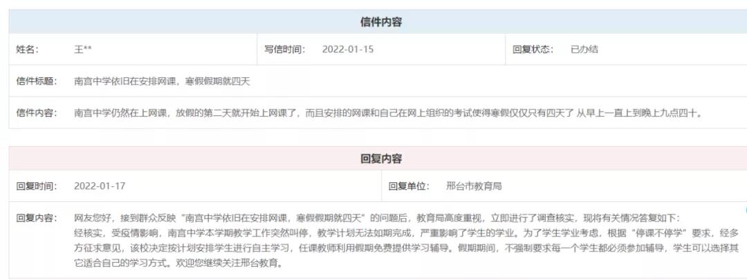 网友您好,收到群众举报内丘中学上网课事宜后,市教育局高度重视,立即安排内丘县教育局进行调查核实,现将相关情况答复如下: