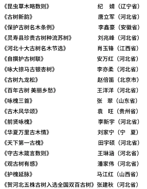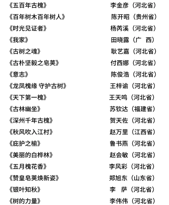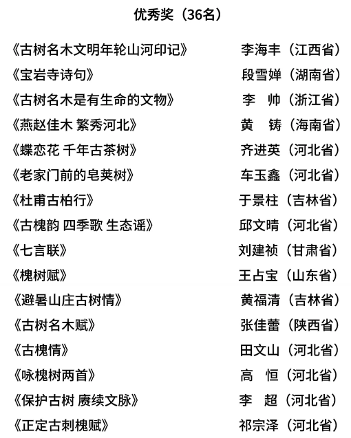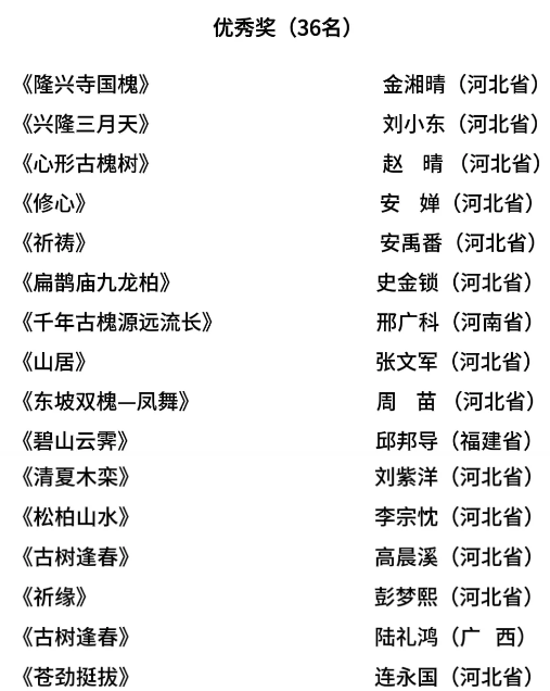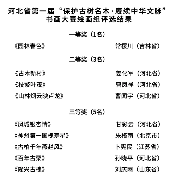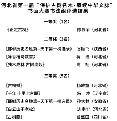 河北省首届“保护古树名木·赓续中华文脉”书画大赛由河北省绿化委员会办公室、河北省关注森林活动执委会、河北省林业和草原局主办,河北广播电视台承办。大赛自6月启动至8月底,历时三个月,收到来自31个省(自治区、直辖市)的广大书画爱好者,各艺术院校、艺术机构专业书画人员参赛作品1285幅。大赛组委会邀请书画领域权威知名书画家,分成书法和绘画两个评审委员会对参赛作品进行了评审。评审专家秉持公平、公正、公开和尊重原创性、艺术性、多元化等原则,从作品表现力、创造力、技巧水平、契合度、思想深度、作品完成度6个维度对参赛作品进行了初评和终评,共评出书法类和绘画类一等奖各1名、二等奖各3名、三等奖各5名、优秀奖各36名,现将获奖名单公示如下: