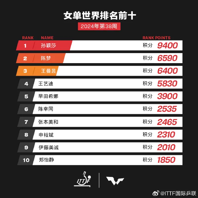 9月17日 国际乒联2024年第38周 世界排名公布 孙颖莎9400分 排名世界第一 女单方面 孙颖莎 、陈梦、王曼昱 、王艺迪 继续排名前四 陈幸同第六