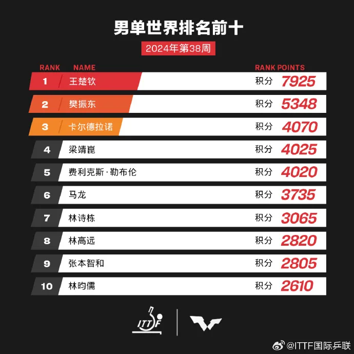 男单方面 王楚钦、樊振东位列前二 梁靖崑第四、马龙第六 林诗栋排名上升至第七 林高远第八