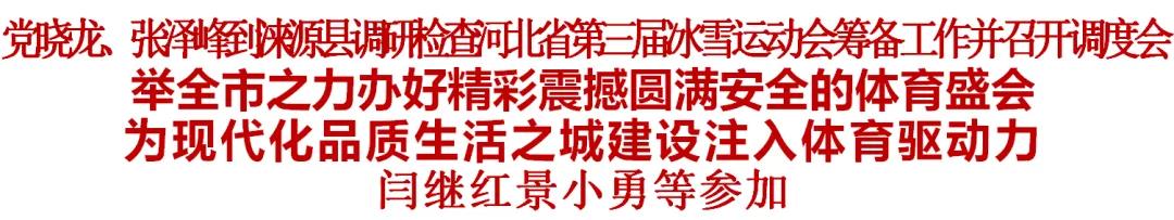 11月17日,在河北省第三届冰雪运动会进入开幕倒计时29天的最后冲刺阶段,市委书记党晓龙,省体育局党组书记、局长张泽峰到涞源县调研检查运动会筹备工作并召开调度会。党晓龙强调,深入学习贯彻党的十九届六中全会精神,高标准落实国家冬奥会战略,以最高的工作标准、最严的工作作风、最实的工作举措、最好的工作状态,全力以赴做好筹备工作,举全市之力办好精彩、震撼、圆满、安全的体育盛会,为现代化品质生活之城建设注入体育驱动力。市委副书记、市长闫继红,中国东方演艺集团党委书记、董事长景小勇参加活动。