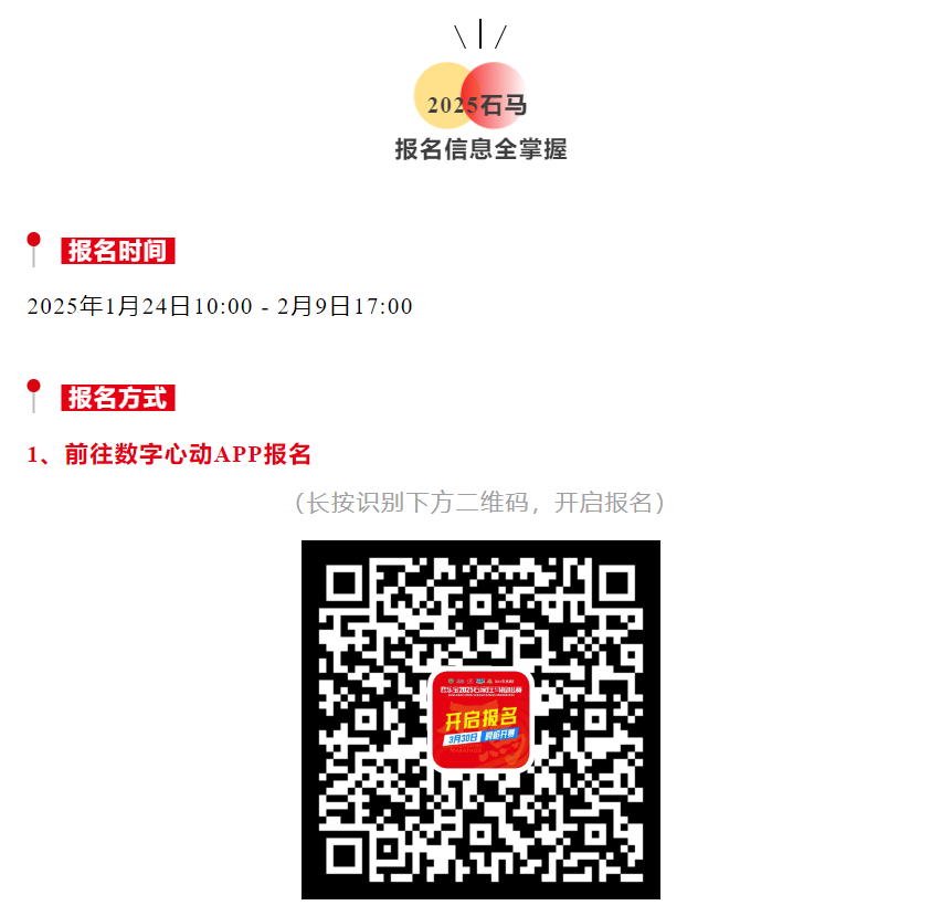 2025年1月24日10:00至2月9日17:00,马拉松、半程马拉松项目报名人数超过限定名额后,将以抽签方式确定参赛资格。