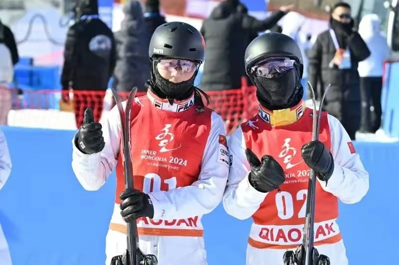 2024年2月22日,第十四届全国冬季运动会自由式滑雪空中技巧比赛,陈雪铮(左)与沈靖怡赛后庆祝胜利。(资料图) 河北日报记者耿辉摄