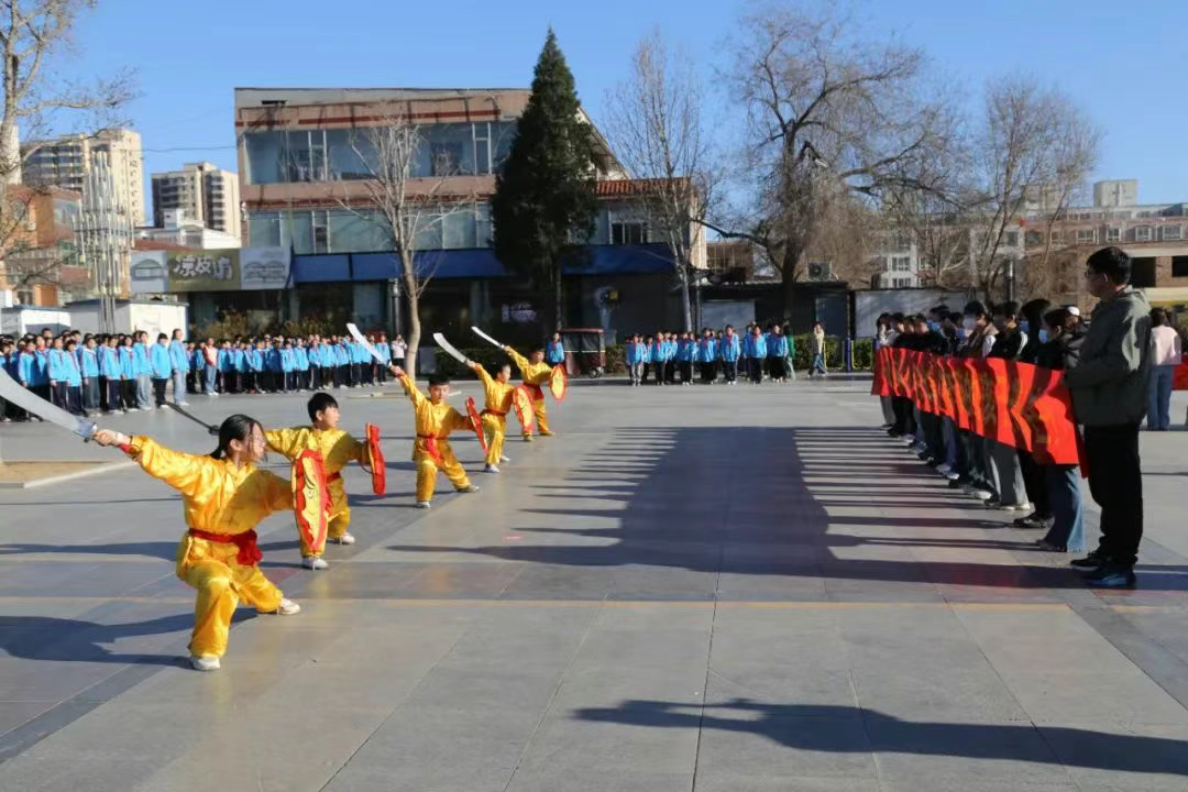 此次阳光体育课以家长观摩学生展演为主。操场上跑操的同学们身着整洁的校服,迈着矫健有力的步伐,口号声震彻校园。跑操队伍的内侧,舞龙队员们个个精神抖擞,配合默契,巨龙在他们手中时而昂首腾飞,时而蜿蜒游走,磅礴的气势让现场观众惊叹不已。学生们展示武术套路。张旭宁 摄