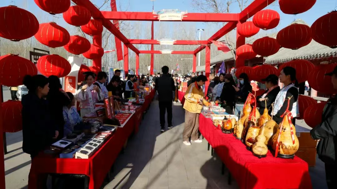 活动现场,满族风情大庙会成为一大亮点。30余个特色展位,展示并售卖易水砚、绞胎瓷、满族结绳等非遗文创产品,以及冰柿、牛岗苹果等易县特色农副产品。3月22日,满族风情大庙会成赛事活动一亮点。郭恩桥 摄