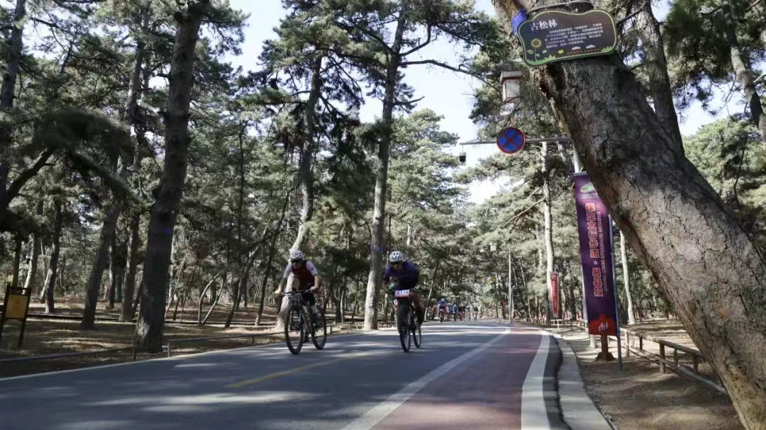 3月22日,众多骑行爱好者在华北最大人工古松林间骑行。郭恩桥 摄