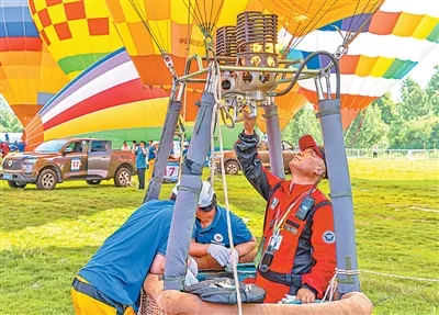 参赛队员在调试热气球喷灯设备。人民日报记者 张武军摄影报道 热气球比赛包含多种趣味科目,核心目标都是“投得准”: 1.指定目标:飞行员需将标志袋精准投向裁判预设的固定靶心,落点越近得分越高。 2.自选目标:飞行员起飞前自行选定一个目标(通常距离起飞点1.5公里外)并报备,最终比拼实际投掷点与自选点的距离,体现策略与胆识。 3.游荡华尔兹:裁判公布多个目标点,飞行员在空中根据风向变化,灵活选择其中一个投掷,体现临场应变。 4.猎狗追兔:“兔球”(裁判球)先起飞,利用高度变化改变方向制造难度。10—15分钟后,“猎狗球”(选手)集体起飞追逐。“兔球”落地铺设靶标后,“猎狗球”需尽快飞抵并投掷标志袋,离靶心越近越好。 5.竞速飞行:在规定时间内比拼飞行距离或完成特定航线的速度,寻找“最快风层”是关键。 6.投标效率:在最短时间内连续完成多个目标点的精准投掷,是对效率与准度的双重考验。 如何观赏热气球比赛? 由于气球无法水平转向,升降是唯一主动控制。上升是为寻找更高层风向,下降则是进入更低层风向或减速。观众可在赛前了解当日比赛项目,如“猎狗追兔”或“自选目标”等。观赛时需要注意气球频繁升降的动作,这往往是飞行员在“换挡”,利用不同高度的风来修正航向、接近目标。猜测飞行员的“驭风”策略是观赛的乐趣之一。