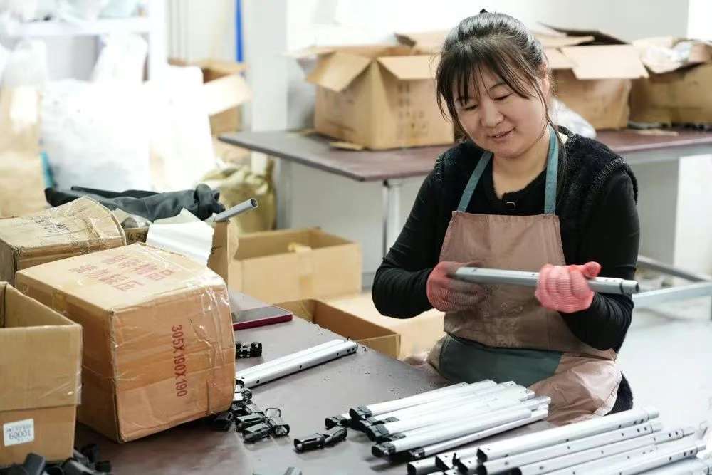 3月27日,一名回迁居民在“雄业创工坊”箱包配件工坊里组装拉杆。