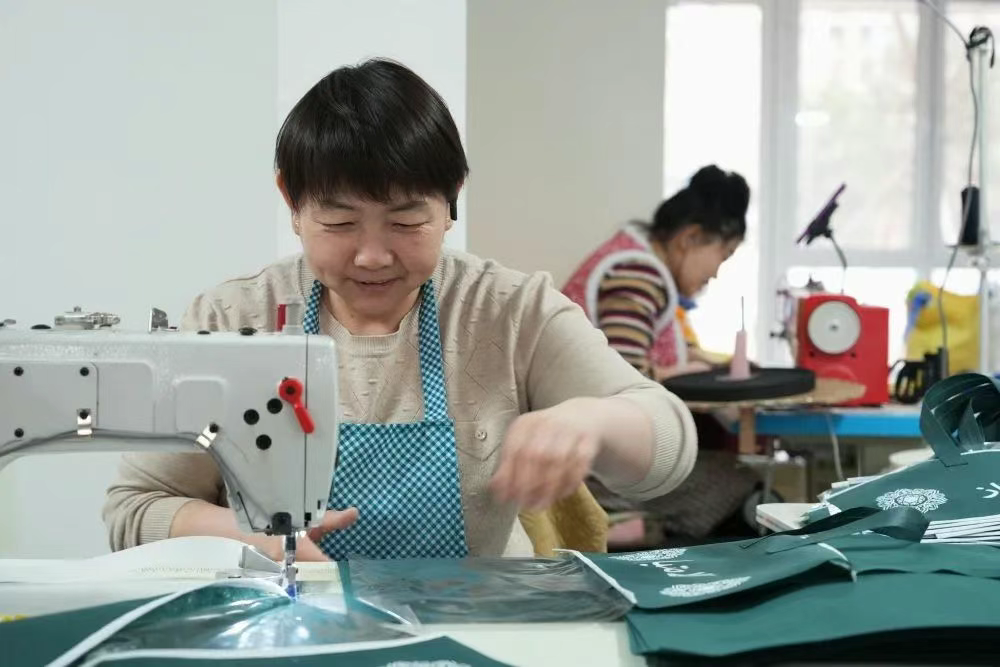 3月27日,回迁居民在“雄业创工坊”塑料包装工坊中工作。