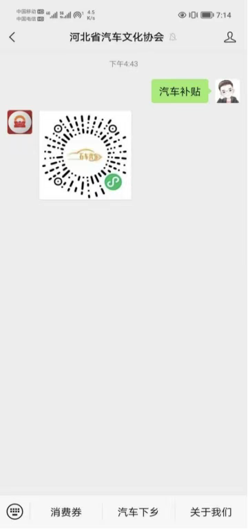 领取购车补贴通道二:打开微信,关注“河北省汽车文化协会”公众号,回复“汽车补贴”,自动弹出“石车秀车网”小程序二维码,长按识别二维码,进入“石车秀车网”小程序,在首页上点击“桥西区汽车促消费补贴领取入口”。