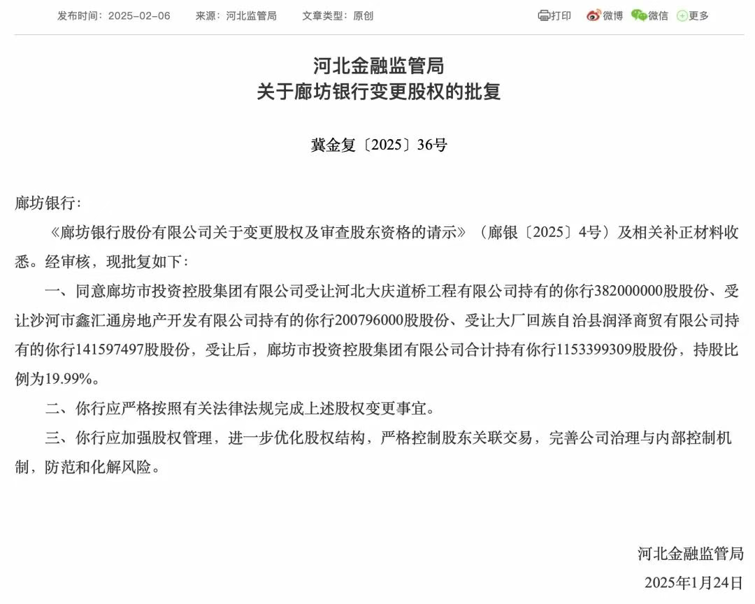 近日,河北金融监管局发布关于廊坊银行变更股权的批复。据《廊坊银行股份有限公司关于变更股权及审查股东资格的请示》(廊银〔2025〕4号)及相关补正材料收悉。