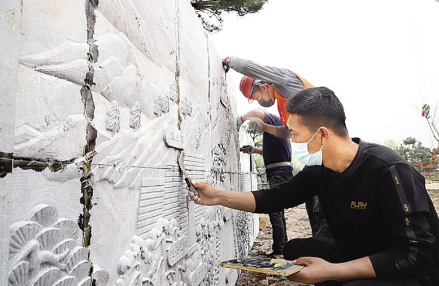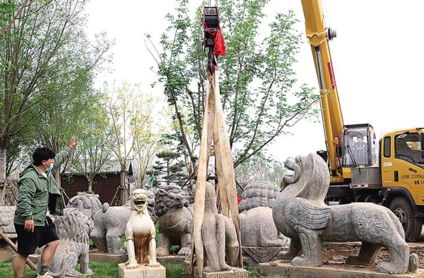 百狮园里,主入口处,由太湖石摆放的狮子造型假山赫然在目,抬头望去,30米长的狮子浮雕墙正在安装,新栽种的4000余棵乔灌木长势良好,沿河垂柳依依,山坡上海棠、碧桃花落满地。运河畔,两座大桥建设正酣,透过围栏,可看到起重机轰鸣作业。