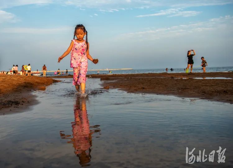 小女孩在一处海滩上的雨水排水口玩耍。经过治理,秦13条主要入海河流全部达到或优于地表水Ⅲ类水质标准。