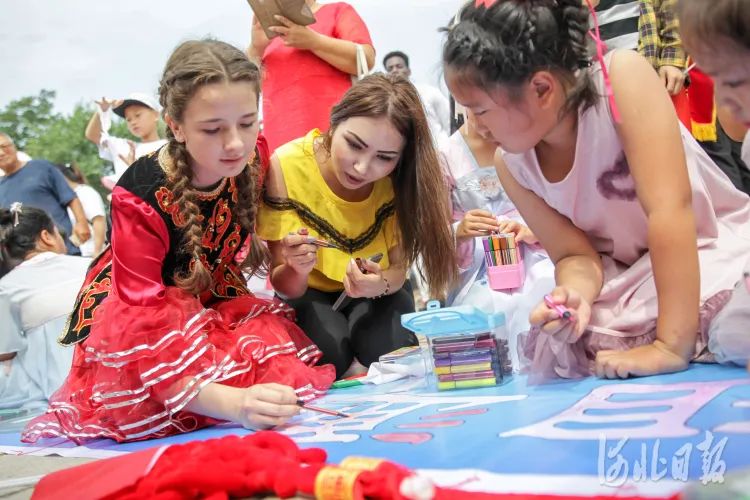 秦皇岛山海关老龙头景区,外国留学生和小朋友一起绘画。