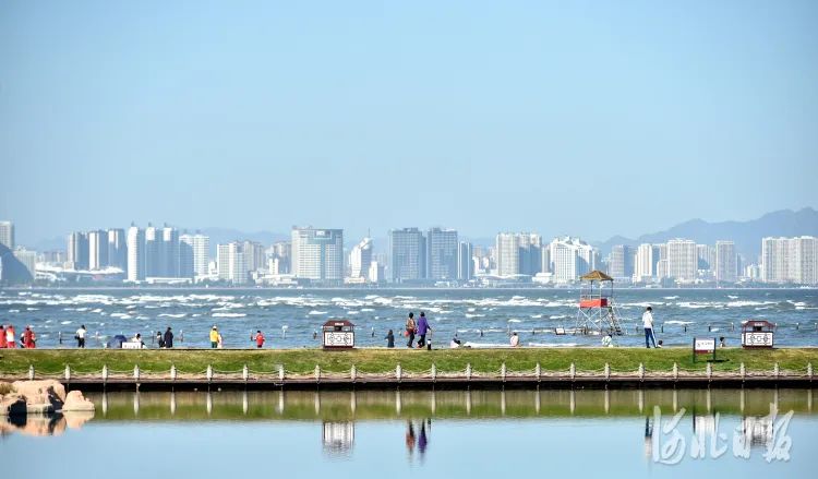 北戴河区鸽子窝公园,游客正在碧海蓝天中游玩。秦皇岛持续改善海水水质,打造“水清、滩净、湾美”的优质海岸带。
