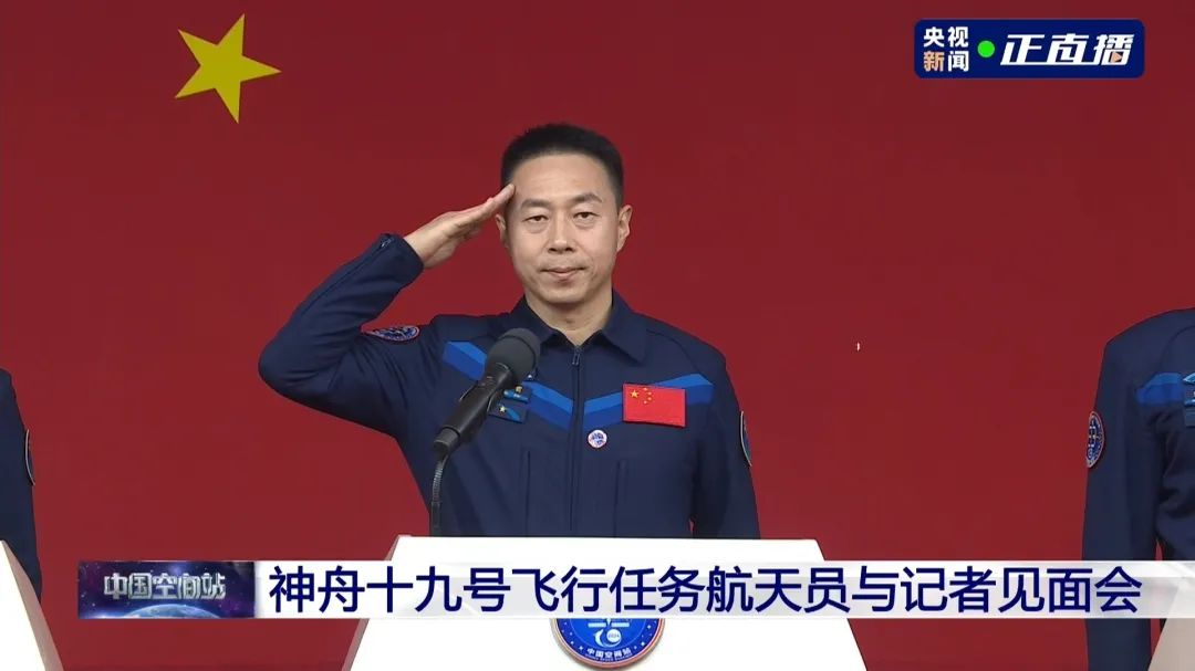10月29日上午,神十九3名航天员在酒泉卫星发射中心问天阁与中外媒体记者集体见面。