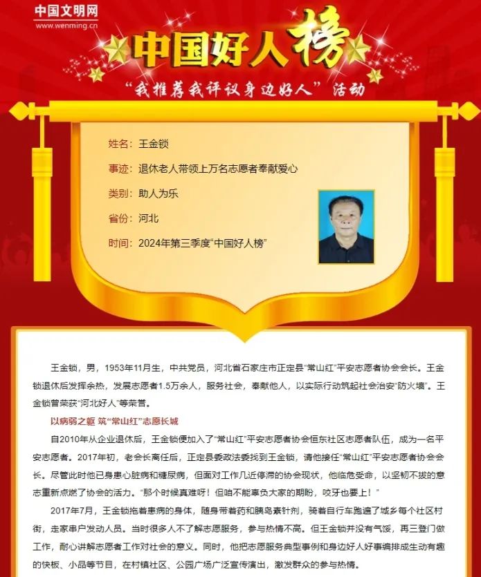 如今,正定古城已经成为了河北文旅的“金名片”,吸引着无数游客前来探访。而这一切,都离不开王金锁和“常山红”志愿者们的默默付出。老骥伏枥,志在千里。年逾古稀的王金锁依然奋战在志愿服务的第一线,他的初心不改,矢志不渝,就是要把这块“常山红”平安志愿服务品牌擦得更红更亮!