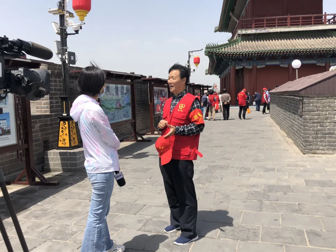 王金锁在正定城墙上接受中央广播电视总台记者采访