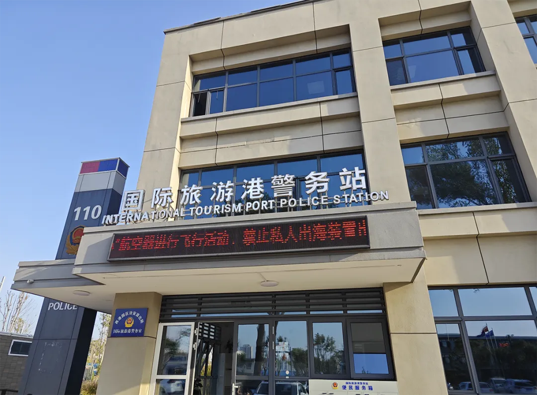 国际旅游港警务站就位于这个园区的中心区域,于2019年9月9日投入使用,为了保障辖区安全,民警24小时值守。