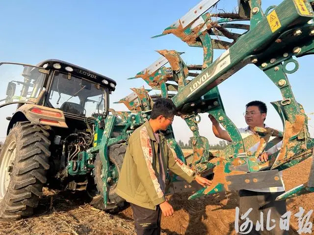 2024年10月20日,在曲周县千亩示范田,叶松林(右)与郝展宏在调试液压翻转犁。