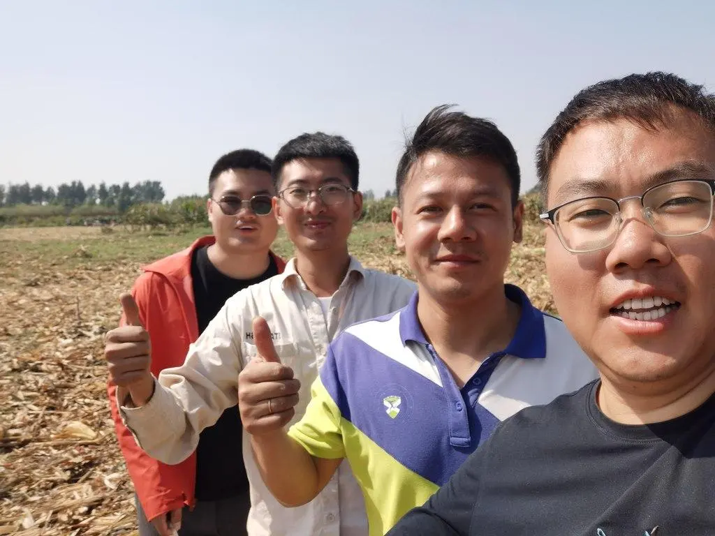 四个人在田间合影,从左到右分别为叶松林、郝展宏、冯小杰、蔡东玉。