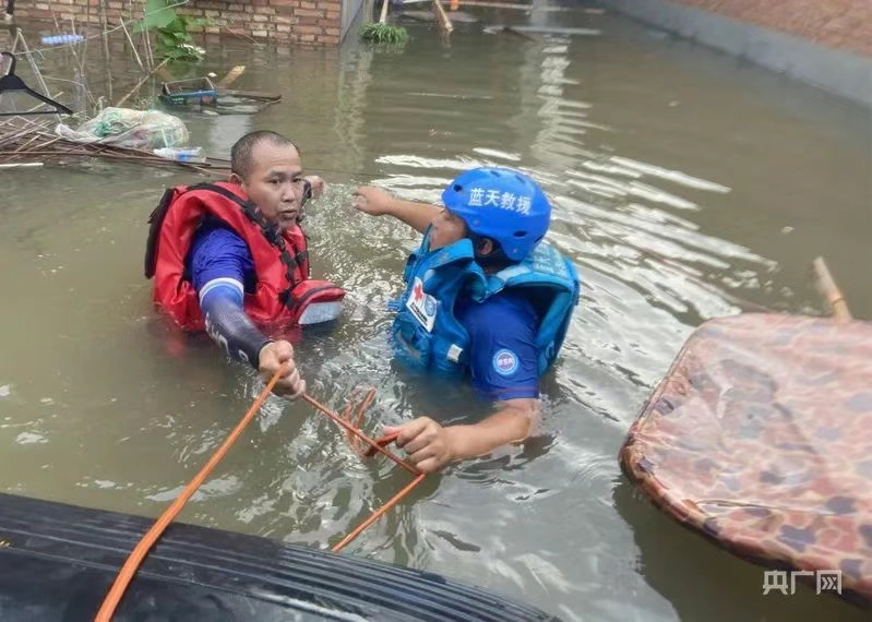 山体救援、车辆打捞救援、地震搜救……10多年来,河北省秦皇岛市蓝天救援队队员晁金军自掏腰包,先后参与100多次救援,累计救援130余人,为身处危难中的人带来生的希望。晁金军(左一)参与洪水救援(央广网发 受访者供图)